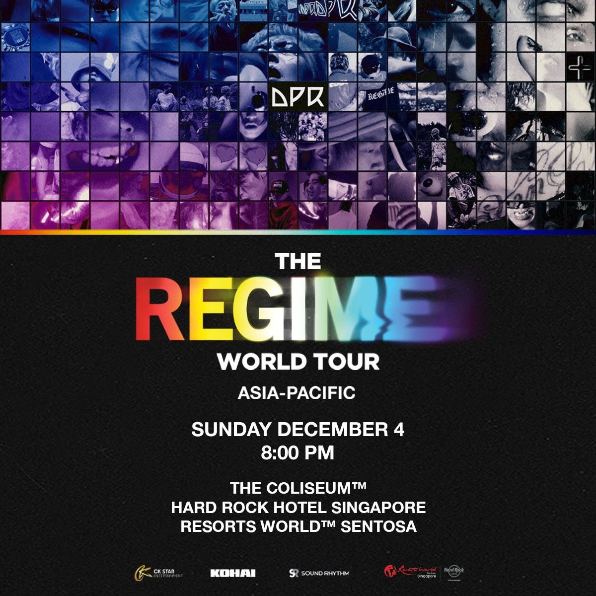 Singapore, 2022 – Previously announced as one of the stops of the Asia Tour, CK Star Entertainment is proud to announce DPR The Regime World Tour in Singapore will be happening on 4 December 2022 at The Coliseum, Hard Rock Hotel Singapore, Resorts World Sentosa! The tickets are priced at VIP $238, Early Entry $158, Standard $118 and will be available via regimetour.com and ticketmaster.sg from 16 September at 12.00pm.
