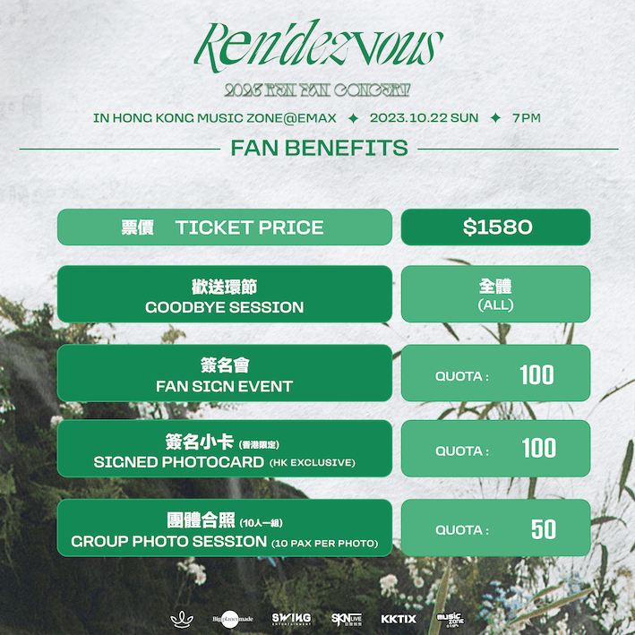 In addition watching REN’s performance up close, this concert is also a rare opportunity as REN has specially prepared a series of fan benefits, including: autograph sessions, farewell sessions, Hong Kong-exclusive signed photo cards, and group photos.