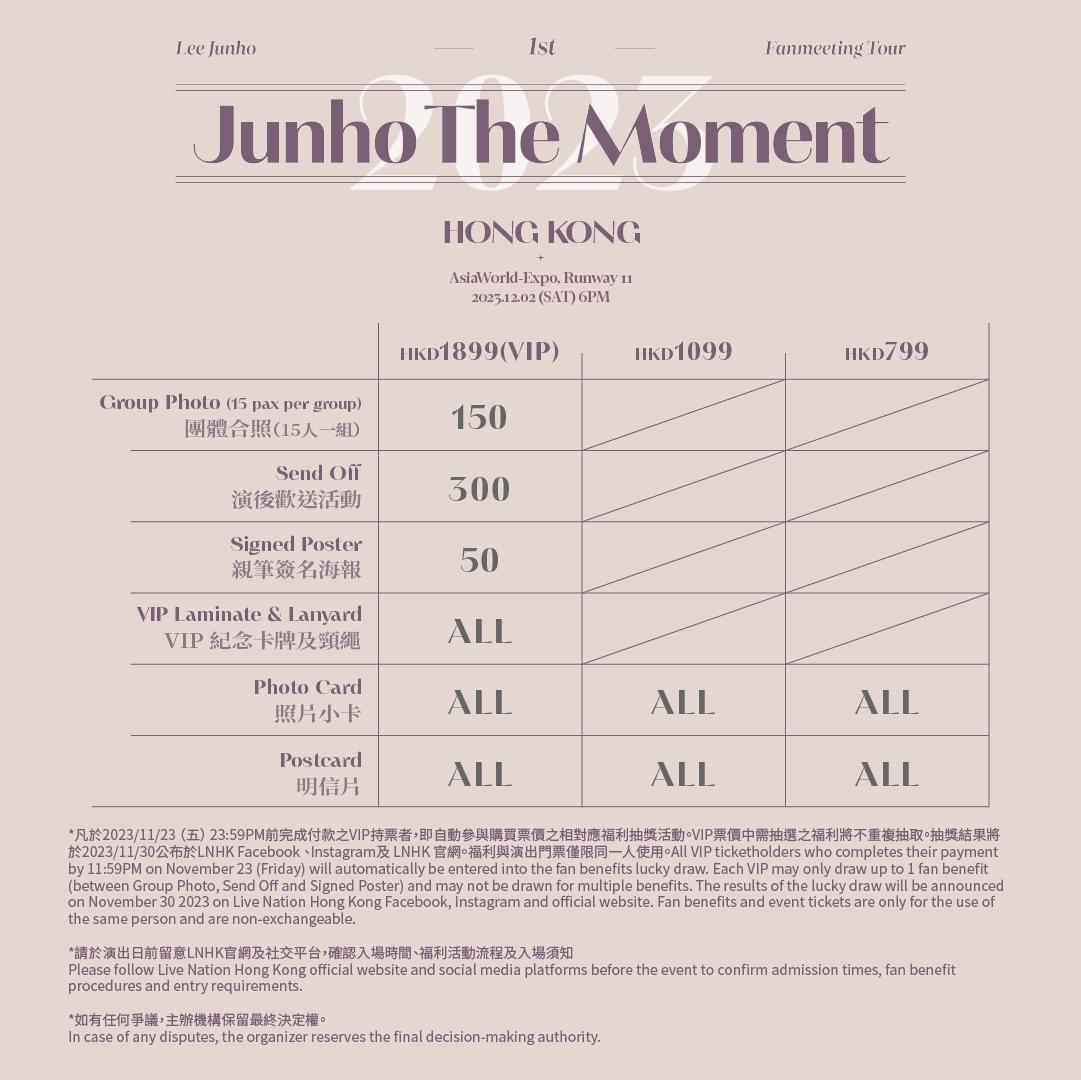 Hong Kong, 2023 – Live Nation announced that Lee Junho, a member of South Korea’s second-generation boy band 2PM and who became an A-list actor with “Red Sleeves”, will hold a special fan meeting “LEE JUNHO 1st FANMEETING TOUR IN HONG KONG” on December 2, 2023 (Saturday) at Hall 11 of AsiaWorld-Expo. Ticket prices start at HKD 799 and will be on sale from 10am on October 10, 2023 (Tuesday) via the http://www.cityline.com website and the ticket purchase hotline +852 2111 5333.